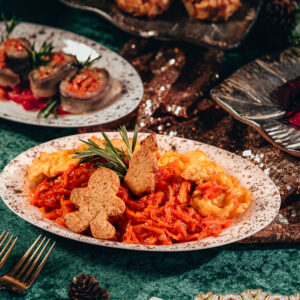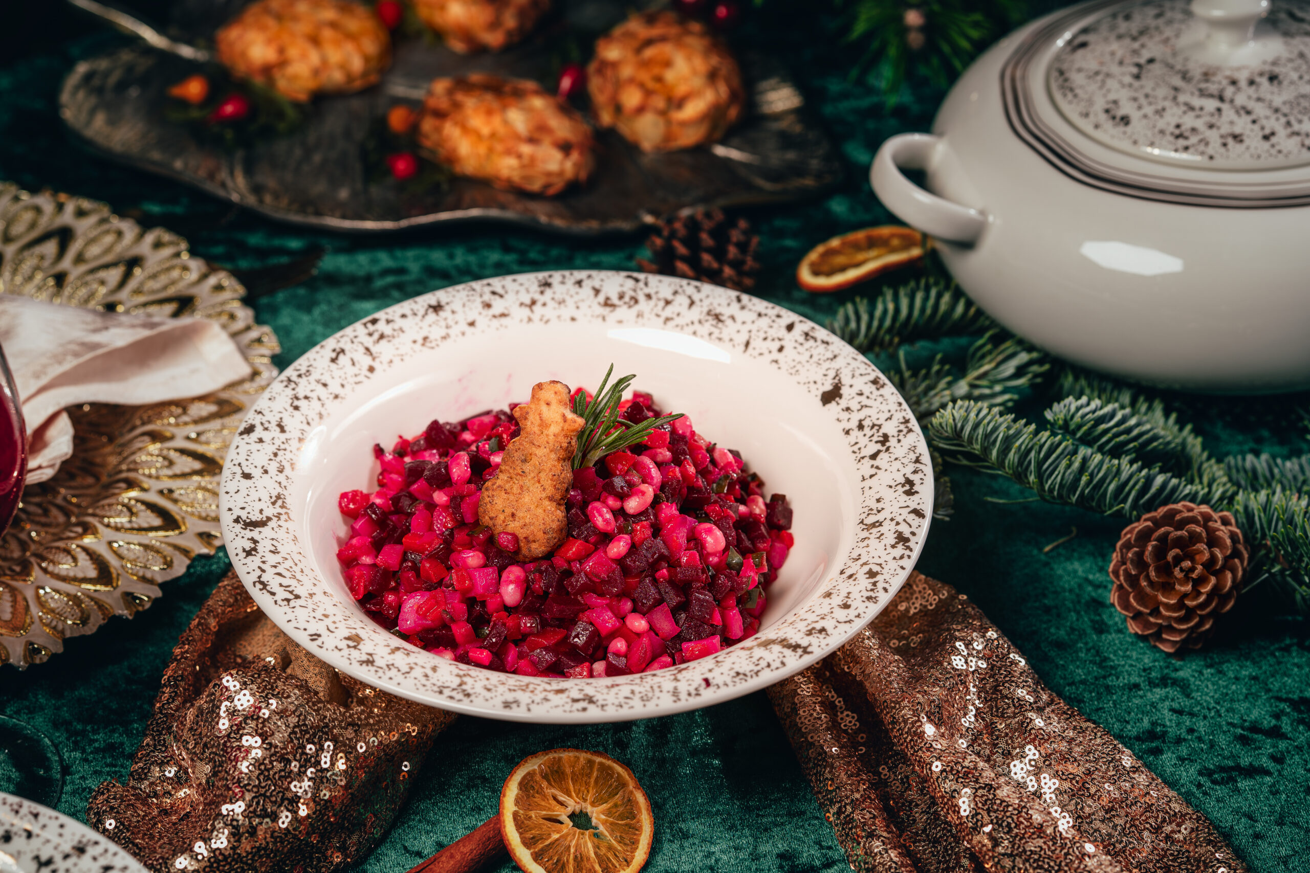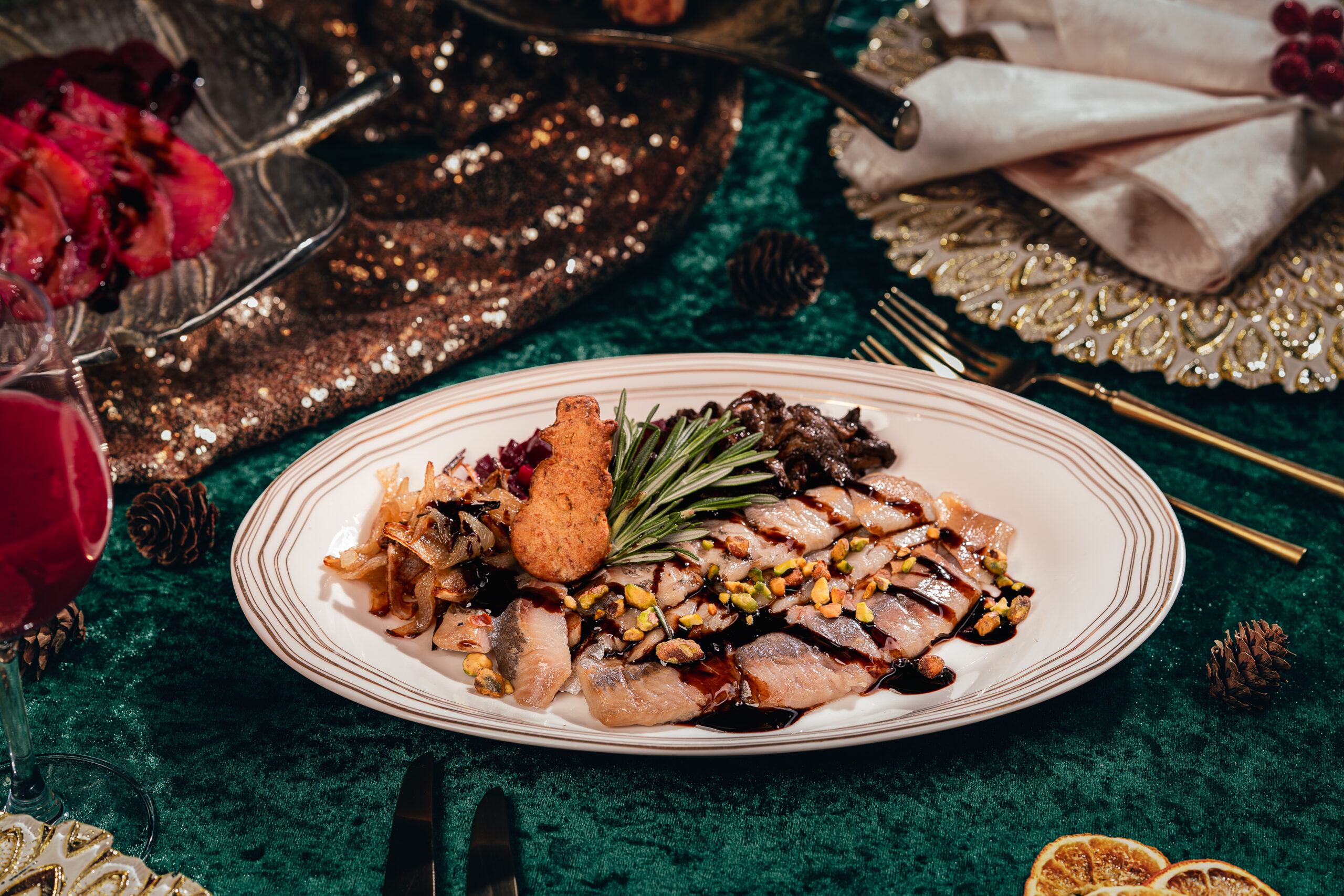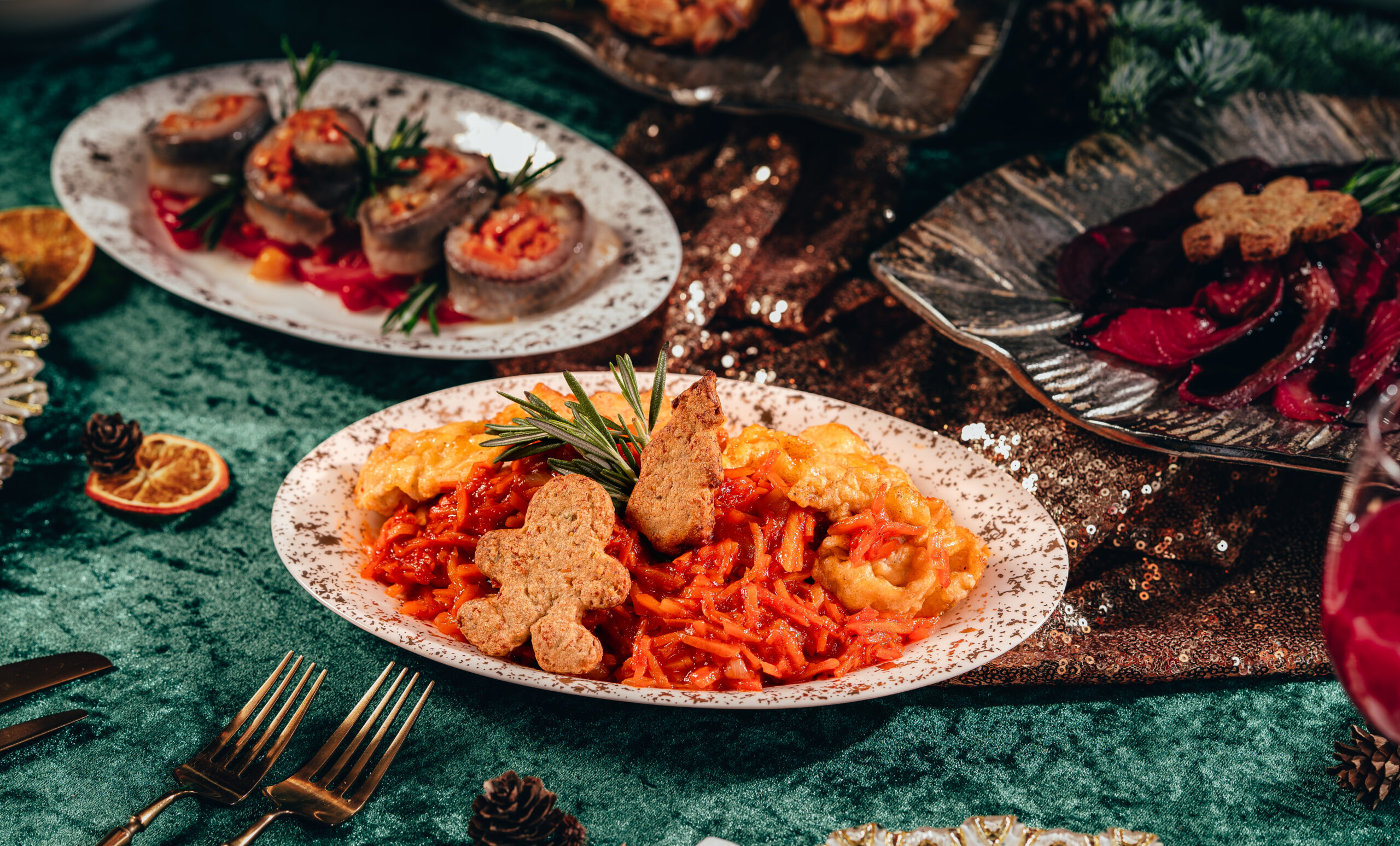 Žuvies kotletukai su migdolų plutele ir špinatais (patiekiama su veganiniu majonezo ir žalumynų padažu) NAUJIENA Sūdytų lašišų riekelės su burokėlių „karpačio“ ir balzamiko kremu Kepta žuvis su senoviniu padažu Silkių suktinukai su troškintomis daržovėmis Silkių filė su burokėliais, keptais miško grybais, balzamikų kremu ir kepintomis pistacijomis NAUJIENA Kibinukai su moliūgų ir miško grybų įdaru bei skrudintomis moliūgų sėklomis NAUJIENA Raudona mišrainė Kopūstų salotos su miško grybais, keptais moliūgais, porais, špinatais ir juodos duonos skrebučais Kūčiukai su aguonomis Aguonų pienas Spanguolių kisielius |