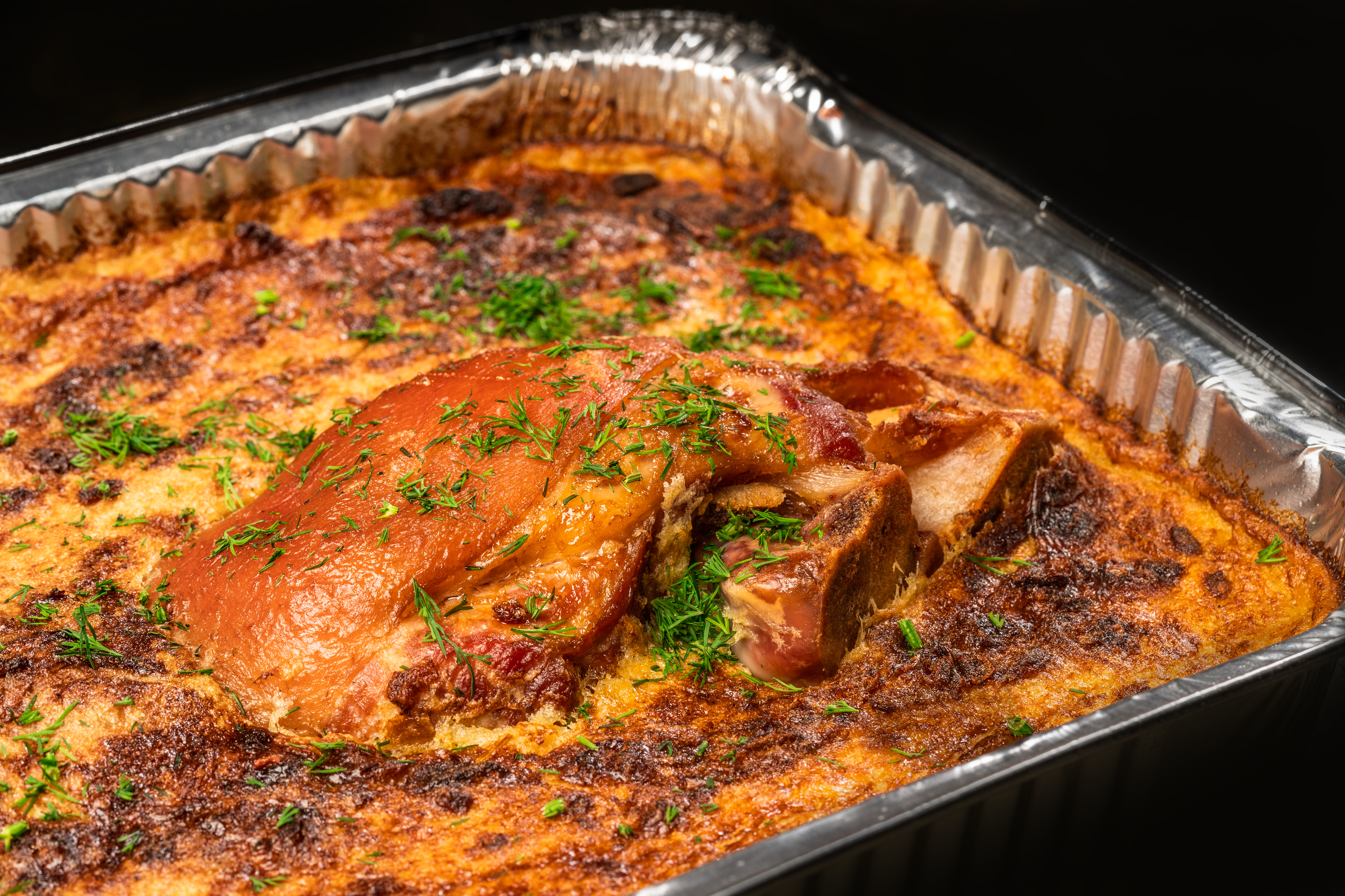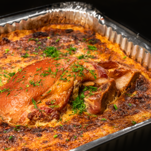 Bulvių plokštainis su rūkyta karka ir 3-imis padažais 4 asmenims (2 kg)