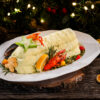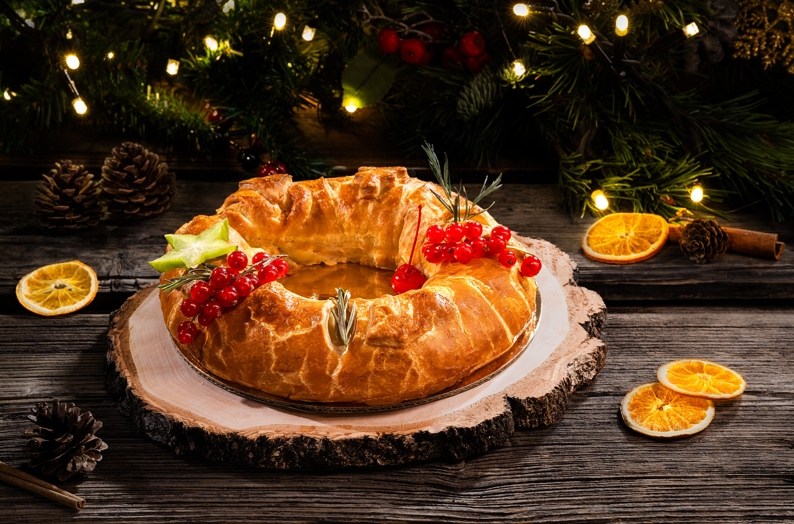 Kalėdinis kapotos tešlos vainikas su vištienos ir kalakutienos įdaru, pagardintas džiovintomis spanguolėmis, pistacijomis ir karamelizuotais svogūnais (900 g)